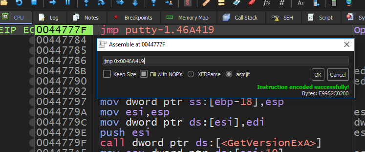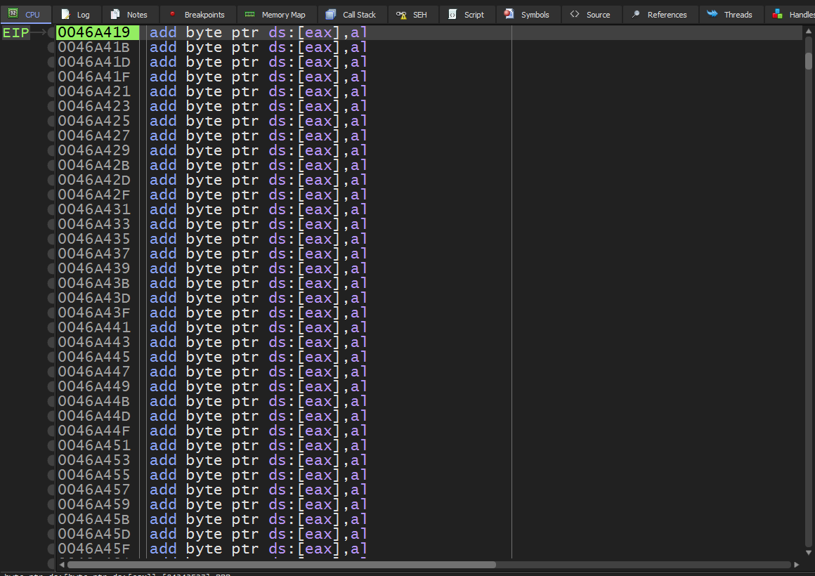 Here, the jmp instruction is being used to alter the execution flow. The address 0044777F represents the point in the code where normal execution would occur, but the jmp forces the CPU to continue execution from 0x0046A419, where our code cave is located, and later where our shellcode will be. After changing this instruction, I did a step into the set address, where we land in an empty area.