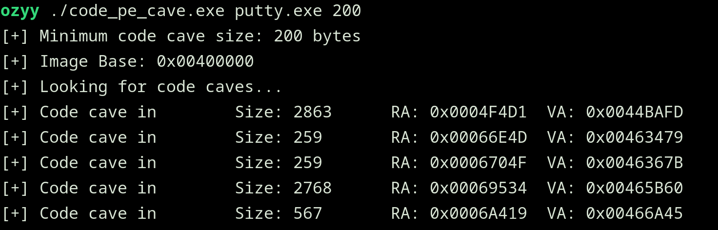 To start building our exploit, I used a tool I developed, available in my GitHub repository called Code_Cave, which is a C tool to find code caves in Portable Executable (PE) files on Windows. It scans the sections of the binary and identifies “empty” byte sequences (0x00 or 0x90) that can be used to inject code.