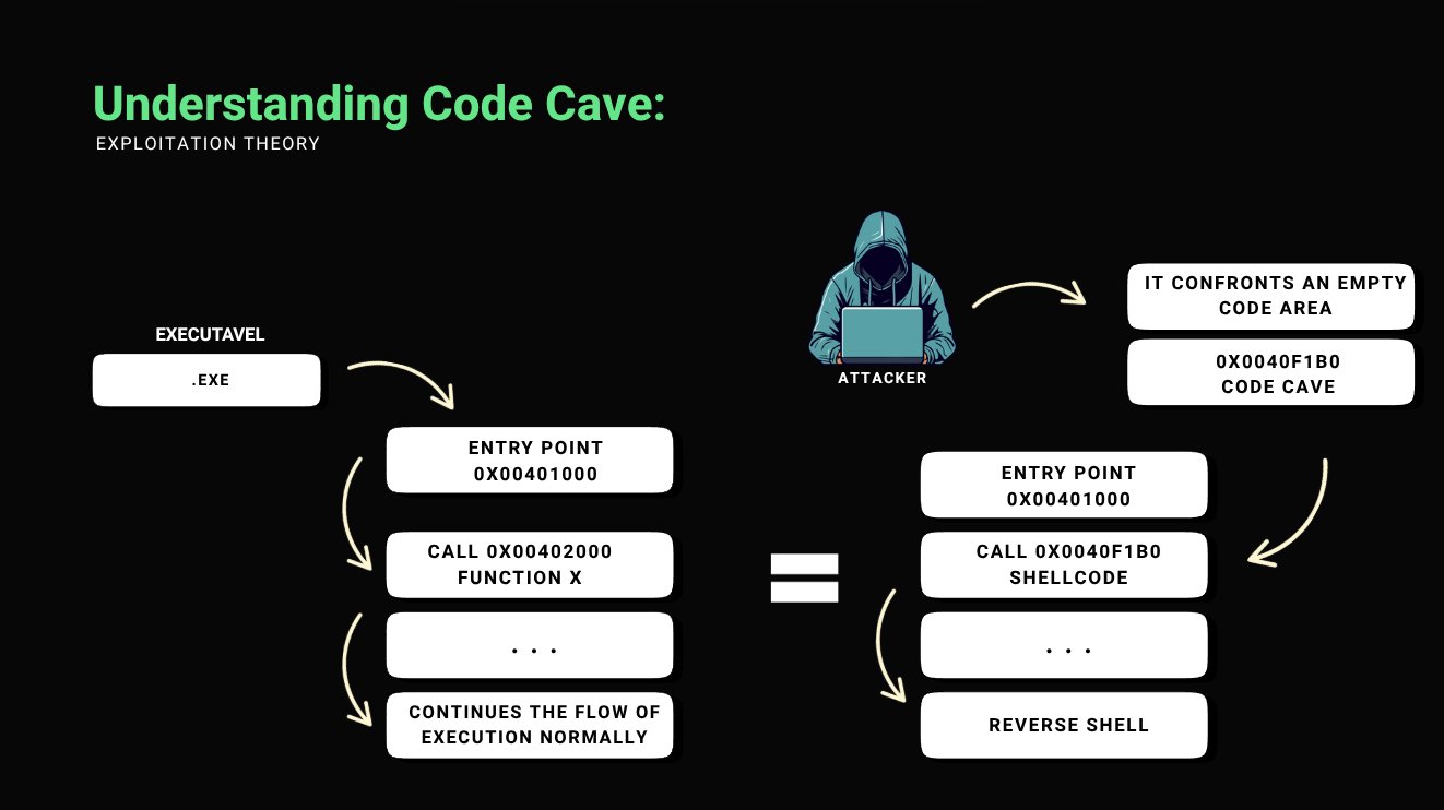In this post I will explore a technique of modification and exploitation of binaries, classified as Code Cave. This technique is nothing more than the exploitation of a memory region or unused space within an executable, usually filled with null bytes (0x00) or irrelevant instructions, where an attacker can inject malicious code without significantly altering the file size.