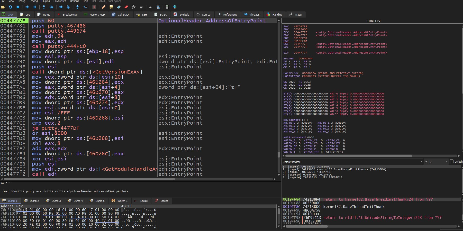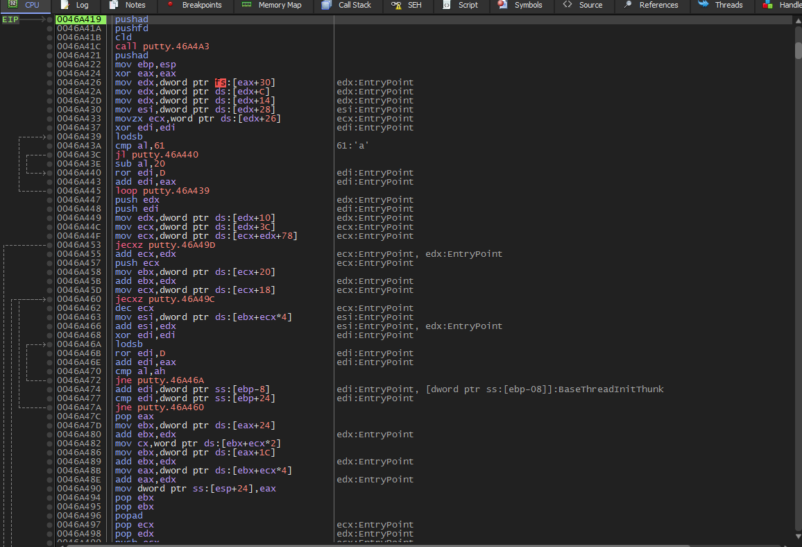 Here it is still an environment preparation, EBP is adjusted to point to the current stack, EAX is zeroed, then there are reads from the segment fs:[…]. From there, pointers are extracted in a chain, possibly to obtain process structures.